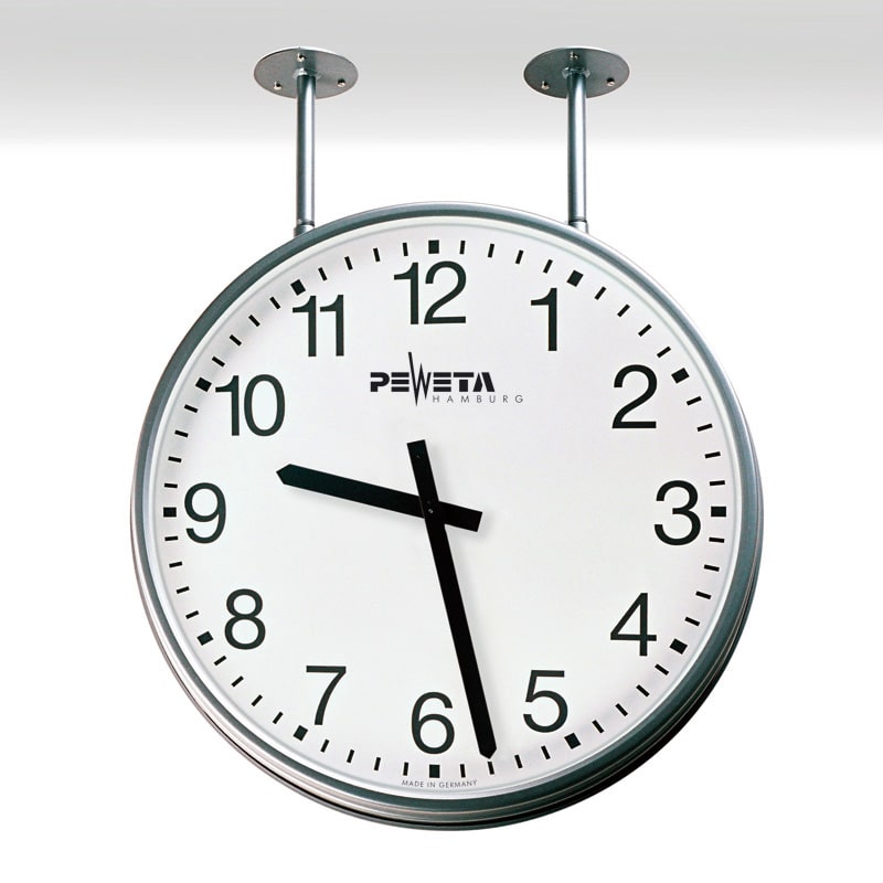 Elektrische, radio gestuurde plafondklok werkend op 230 volt netstroom, bestemd voor buitenruimtes, zoals haltes, perrons en schoolcampussen. Op deze weerbestendige, dubbelzijdige plafondklok leest u, dankzij de grote en duidelijke cijfers, in één oogopslag de tijd precies af. Dus een moderne en functionele plafondklok die ideaal is voor gebruik bij bedrijven en instituties, bijvoorbeeld op het busof treinstation en het bedrijfsterrein.
