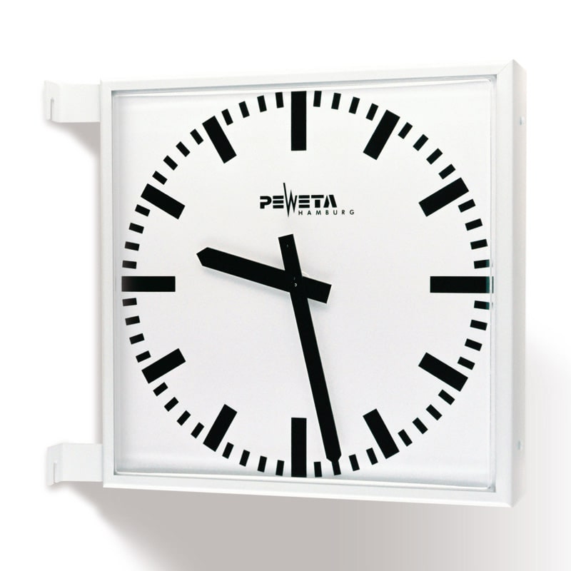 Elektrische radio gestuurde wandklok (incl. LED-achtergrondverlichting) werkend op 230 volt netstroom, bestemd voor buitenruimtes, zoals haltes, perrons en schoolcampussen. Op deze weerbestendige, dubbelzijdige wandklok leest u, dankzij de grote, duidelijke wijzers en minutenstreepjes, in één oogopslag de tijd precies af. Dus een moderne en functionele wandklok die ideaal is voor gebruik bij bedrijven en instituties, bijvoorbeeld op het bus- of treinstation en het bedrijfsterrein.