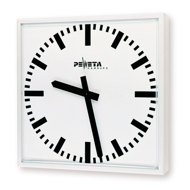 • Witte, acrylkunststof wijzerplaat (5 mm dik) met extra grote minutenstreepjes, zodat de tijd ook op grote afstand duidelijk te bepalen is (bedrukt volgens norm DIN 41091).