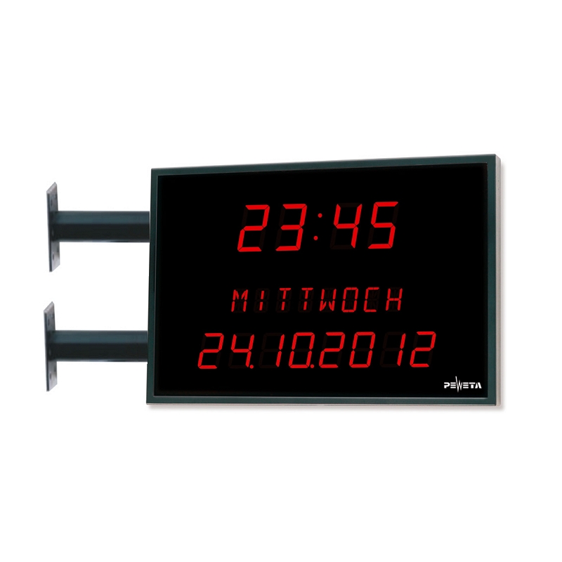 Elektrische, radio gestuurde kalenderwandklok werkend op 230 volt netstroom, bestemd voor binnen. Op deze dubbelzijdige digitale LED-wandklok leest u, dankzij de grote en duidelijke cijfers, in één oogopslag de tijd precies af. Dus een moderne en functionele wandklok die ideaal is voor gebruik bij publieke ruimtes met een receptie- of afsprakenbalie, zoals een apotheek of polikliniek.