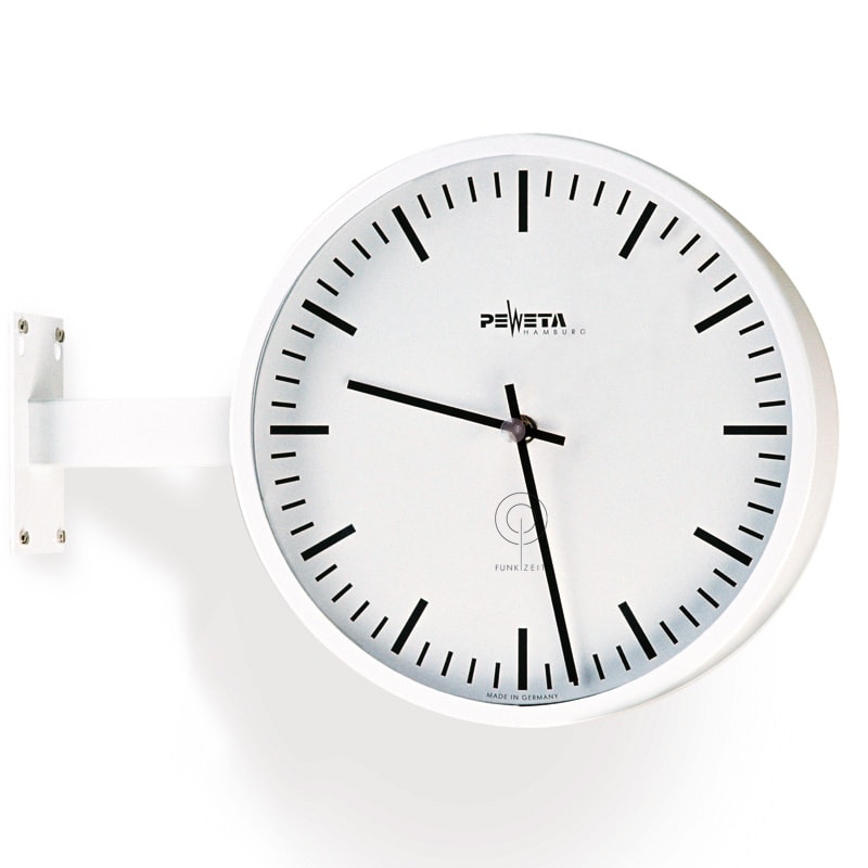 Elektrische, radio gestuurde wandklok werkend op 230 volt netstroom, bestemd voor binnen. Op deze dubbelzijdige wandklok leest u, dankzij de grote, duidelijke wijzers en minutenstreepjes, in één oogopslag de tijd precies af. Dus een moderne en functionele wandklok die ideaal is voor gebruik bij bedrijven en instituties, zoals op kantoor, fabriekshal en in de kantine.