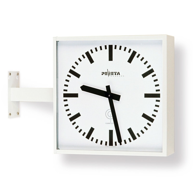 Elektrische, radio gestuurde wandklok werkend op 230 volt netstroom, bestemd voor binnen. Op deze dubbelzijdige vierkante wandklok leest u, dankzij de grote, duidelijke wijzers en minutenstreepjes, in één oogopslag de tijd precies af. Dus een moderne en functionele wandklok die ideaal is voor gebruik bij bedrijven en instituties, zoals op kantoor, fabriekshal en in de kantine.