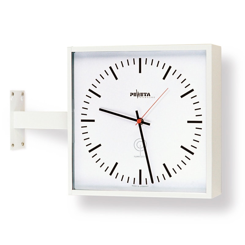 Elektrische, radio gestuurde wandklok werkend op 230 volt netstroom, bestemd voor binnen. Op deze dubbelzijdige wandklok leest u, dankzij de grote, duidelijke wijzers en minutenstreepjes, in één oogopslag de tijd precies af. Dus een moderne en functionele wandklok die ideaal is voor gebruik bij bedrijven en instituties, zoals op kantoor, fabriekshal en in de kantine.