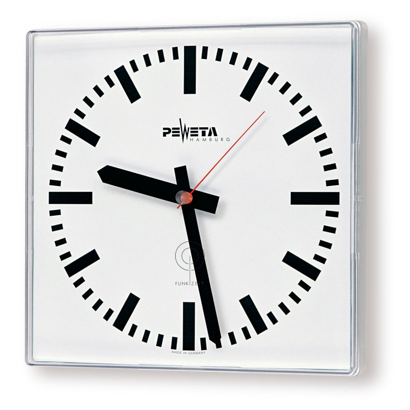 Elektrische, radio gestuurde Wandklok werkend op 230 volt netstroom, bestemd voor binnen. Op deze eenzijdige, vierkante wandklok leest u, dankzij de grote, duidelijke wijzers en minutenstreepjes, in één oogopslag de tijd precies af. Dus een moderne en functionele wandklok die ideaal is voor gebruik bij bedrijven en instituties, zoals op kantoor, fabriekshal en in de kantine.