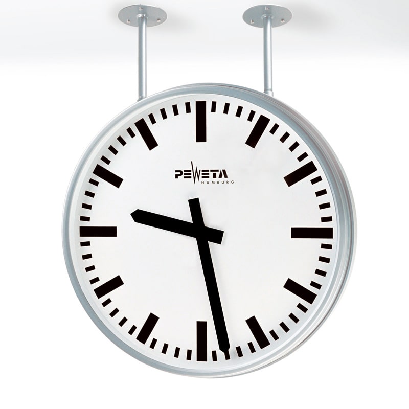 Elektrische, radio gestuurde plafondklok werkend op 230 volt netstroom, bestemd voor extra grote binnenruimtes, zoals hallen en productielijnen. Op deze dubbelzijdige plafondklok leest u, dankzij de grote, duidelijke wijzers en minutenstreepjes, in één oogopslag de tijd precies af. Dus een moderne en functionele plafondklok die ideaal is voor gebruik bij bedrijven en instituties, bijvoorbeeld in de fabriekshal of productieruimte.