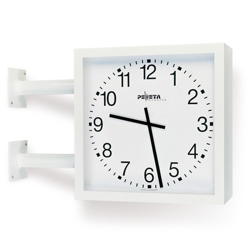 Elektrische, radio gestuurde wandklok werkend op 230 volt netstroom, bestemd voor binnen. Op deze dubbelzijdige, vierkante wandklok leest u, dankzij de grote en duidelijke cijfers, in één oogopslag de tijd precies af. Dus een moderne en functionele wandklok die ideaal is voor gebruik bij bedrijven en instituties, bijvoorbeeld in de fabriekshal of productieruimte.