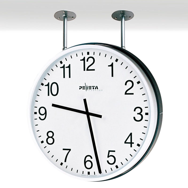 Elektrische, radio gestuurde plafondklok werkend op 230 volt netstroom, bestemd voor extra grote binnenruimtes, zoals hallen en productielijnen. Op deze dubbelzijdige plafondklok leest u, dankzij de grote en duidelijke cijfers, in één oogopslag de tijd precies af. Dus een moderne en functionele plafondklok die ideaal is voor gebruik bij bedrijven en instituties, bijvoorbeeld in de fabriekshal of productieruimte.