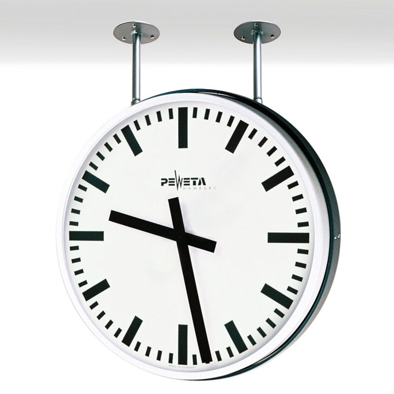 Elektrische, radio gestuurde plafondklok werkend op 230 volt netstroom, bestemd voor extra grote binnenruimtes, zoals hallen en productielijnen. Op deze dubbelzijdige plafondklok leest u, dankzij de grote, duidelijke wijzers en minutenstreepjes, in één oogopslag de tijd precies af. Dus een moderne en functionele plafondklok die ideaal is voor gebruik bij bedrijven en instituties, bijvoorbeeld in de fabriekshal of productieruimte.