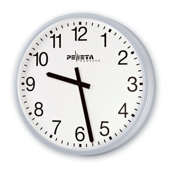 • Witgelakte metalen wijzerplaat met grote cijfers en minutenstreepjes, zodat de tijd ook op grote afstand duidelijk te bepalen is (bedrukt volgens norm DIN 41091).