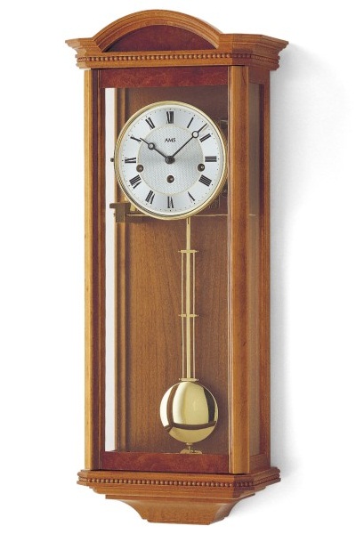 Regulateur met een kast van kersen- en kersen wortel hout, mineraalglas aan de voorkant en de zijkanten. De slinger en rand om de wijzerplaat zijn van messing, de wijzerplaat is van hoogwaardig verzilverd metaal. Met een Westminster slagwerk ieder kwartier, het slagwerk is uit te schakelen. Afmetingen: 66 x 26 x 15 cm. Mechanisch 8-daags uurwerk, dient 1x per week te worden opgedraaid. Deze klok is van het Duitse kwaliteitsmerk Ams. De garantietermijn bedraagt 24 maanden.