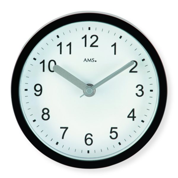 • Klok 5928 is een waterdichte badkamerklok met een zwarte kunststof rand en een mineraalglas voor de wijzerplaat.