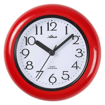 • Klok 454-1A is een waterdichte badkamerklok in een rode kunststof uitvoering met zwarte binnenrand, witte wijzerplaat met zwarte opgedrukte cijfers en zwarte wijzers.
