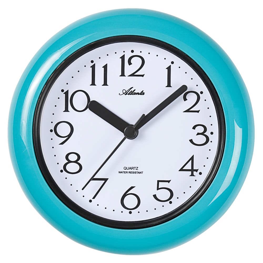 • Klok 454-6A is een waterdichte badkamerklok in een turquoise kunststof uitvoering met zwarte binnenrand, witte wijzerplaat met zwarte opgedrukte cijfers en zwarte wijzers.