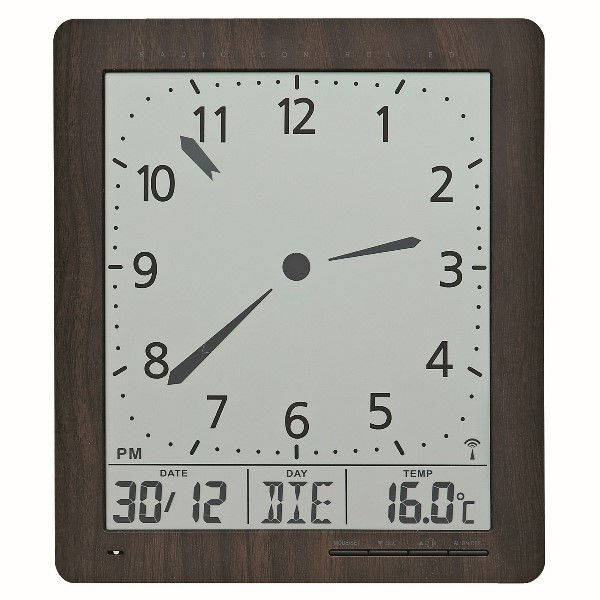 • Klok 5893 is een digitale klok met notenhouten motief, analoge weergavestijl te gebruiken als wand- en tafelklok.