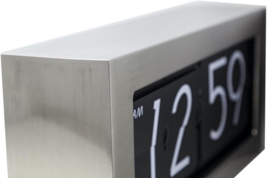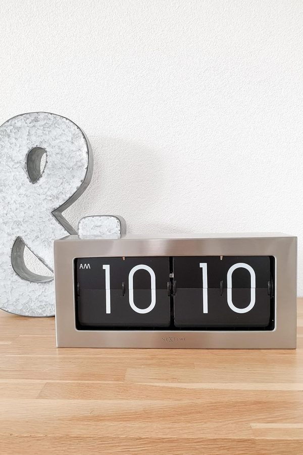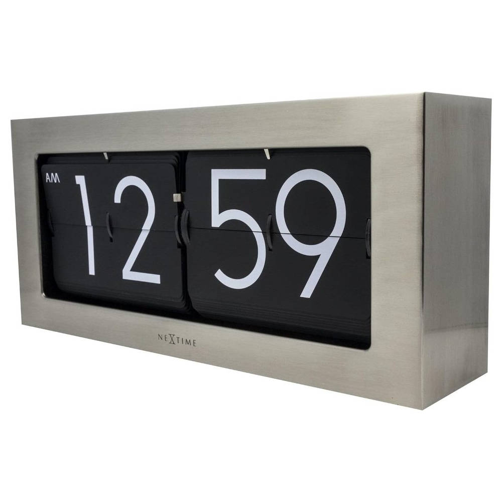 • Klok NE5198ZI is een grote flip klok in een zilverkleurige mat stalen uitvoering met witte cijfers op zwarte bladen.