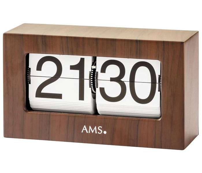 • Klok 1177 is een flip klok van metaal in een notenhouten motief uitvoering met zwarte cijfers op witte bladen.