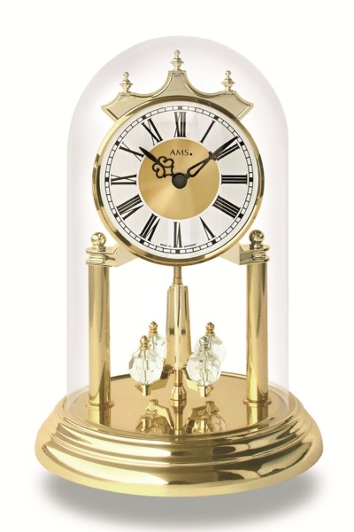 • Klok 1202 is een jaarpendule stolpklok in een messing gekleurde uitvoering met kristal ballen en een glazen stolp.