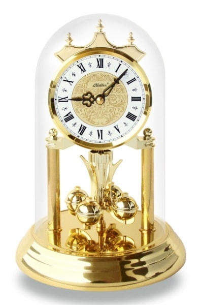• Klok 821-080H is een jaarpendule stolpklok in een messing gekleurde uitvoering met een glazen stolp, op de wijzerplaat is een motief afgebeeld.