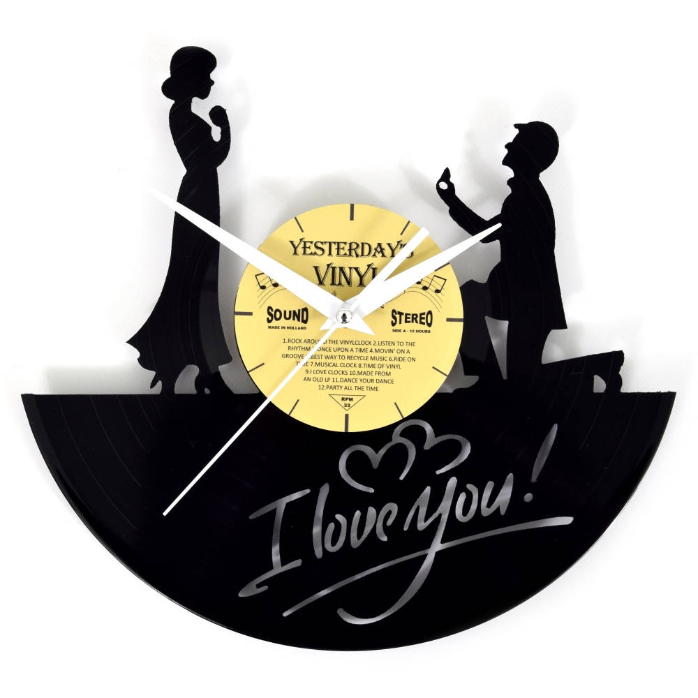 Klok 601-3210 is een LP klok met uniek uitgefreesd I love you design van een huwelijksaanzoek. Dit prachtige herkenbare ontwerp brengt voor velen herinneringen naar boven van het traditionele huwelijksaanzoek. Naast dat het een prachtige klok is om bij een huwelijksaanzoek te gebruiken, is deze ook uitermate geschikt om iedere dag weer terug te kunnen denken aan een van de meest bijzondere momenten in het leven.