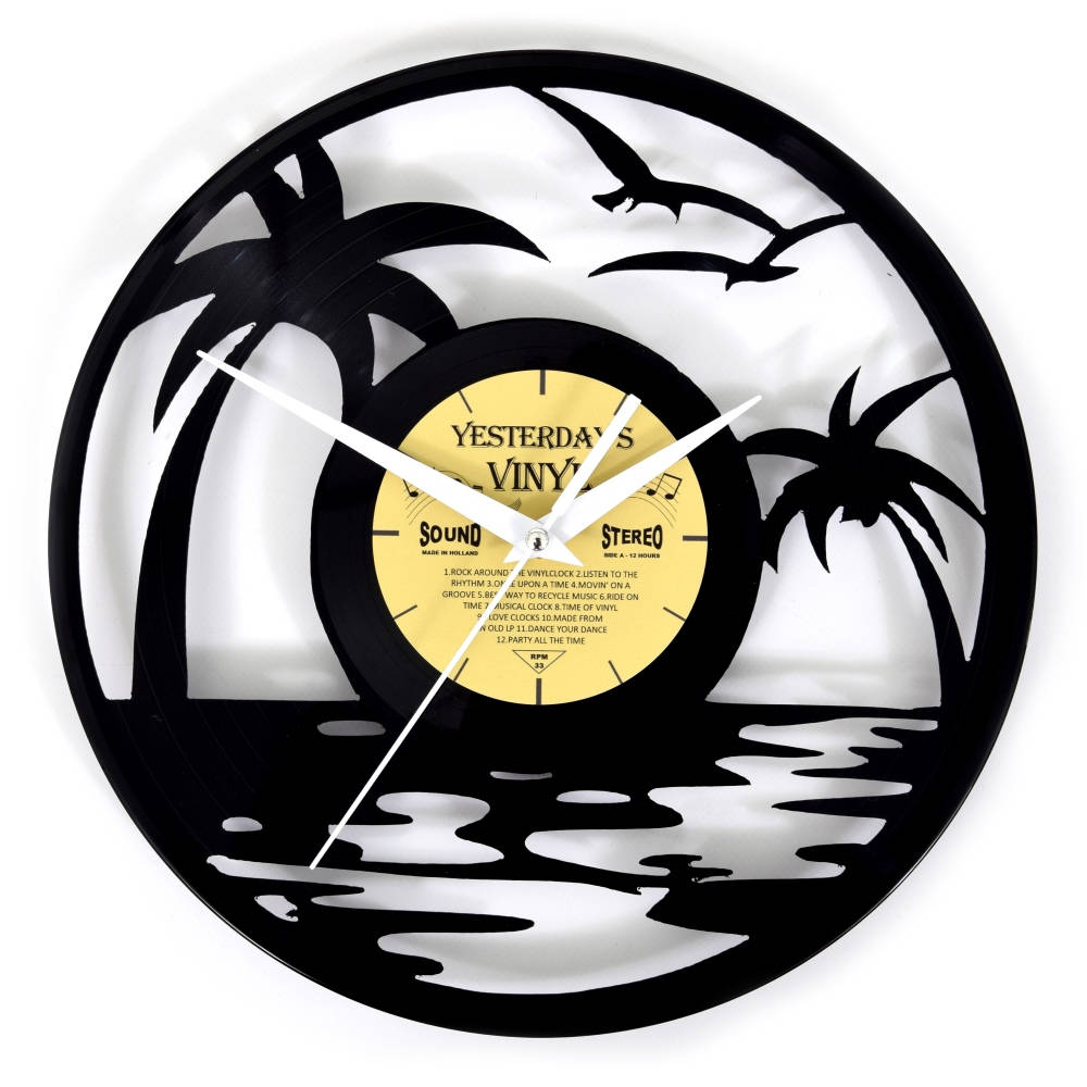 Klok 601-3204 is een LP klok met uniek uitgefreesd design van een strand met palmbomen en vogels. Dit leuke herkenbare tafereel brengt herinneringen en verlangens naar een mooie vakantie in een warm land naar boven. Deze klok is ook zeker een aanrader om er iedere dag weer naar uit te kunnen kijken en wellicht af te tellen naar een mooie geplande zonvakantie.