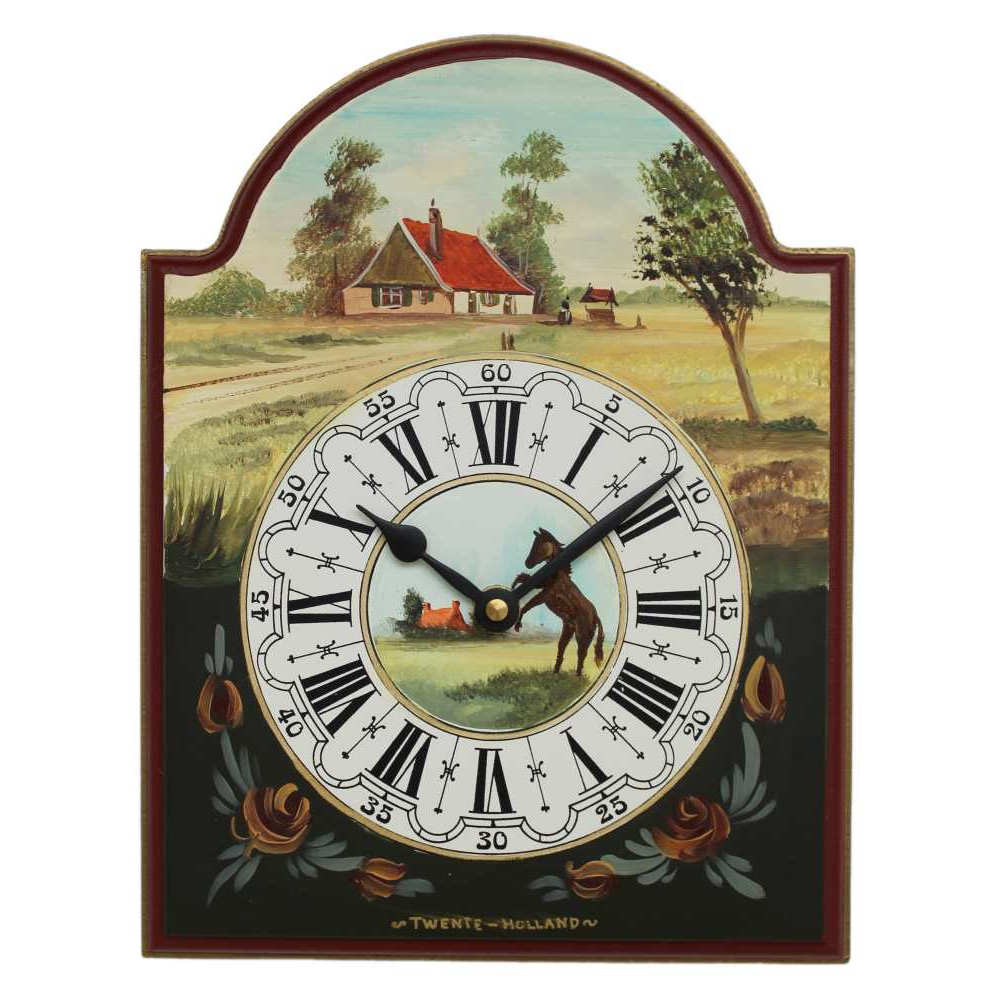 • Klok 140-809 is een handbeschilderde houten schilderij klok waarop een Twents plattelandstafereel met een boerderij, paard, weide en bomen is afgebeeld.