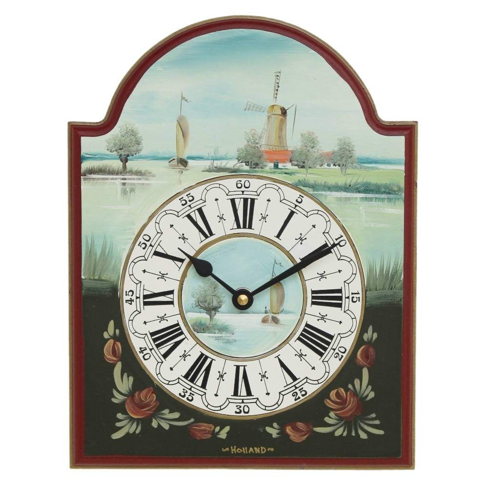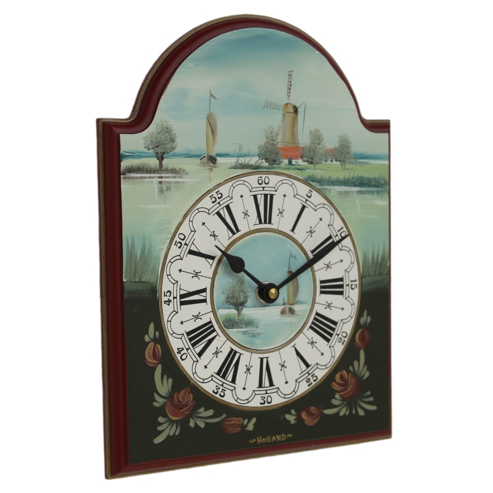 • Klok 140-803 is een handbeschilderde houten schilderij klok waarop een klassiek Hollands polderlandschap met een molen, zeilboten en bomen is afgebeeld.