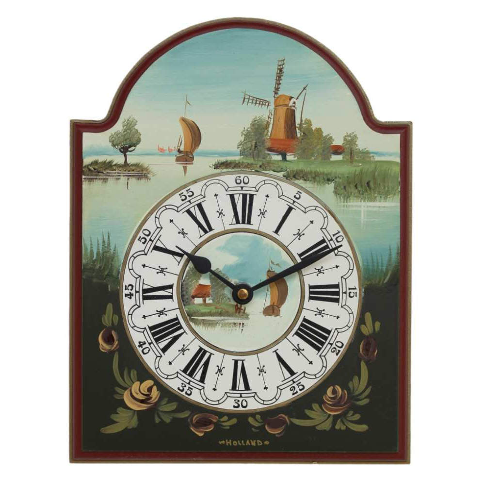 • Klok 140-808 is een handbeschilderde houten schilderij klok waarop een klassiek Hollands polderlandschap met een molen, zeilboten, bomen en water is afgebeeld.