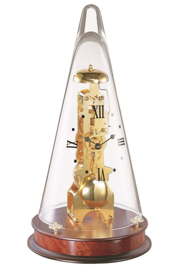 • Klok 22716-070791 is een design skelet tafelklok met een mahoniehouten sokkel waarop het messing uurwerk staat met een glazen stolp er overheen.