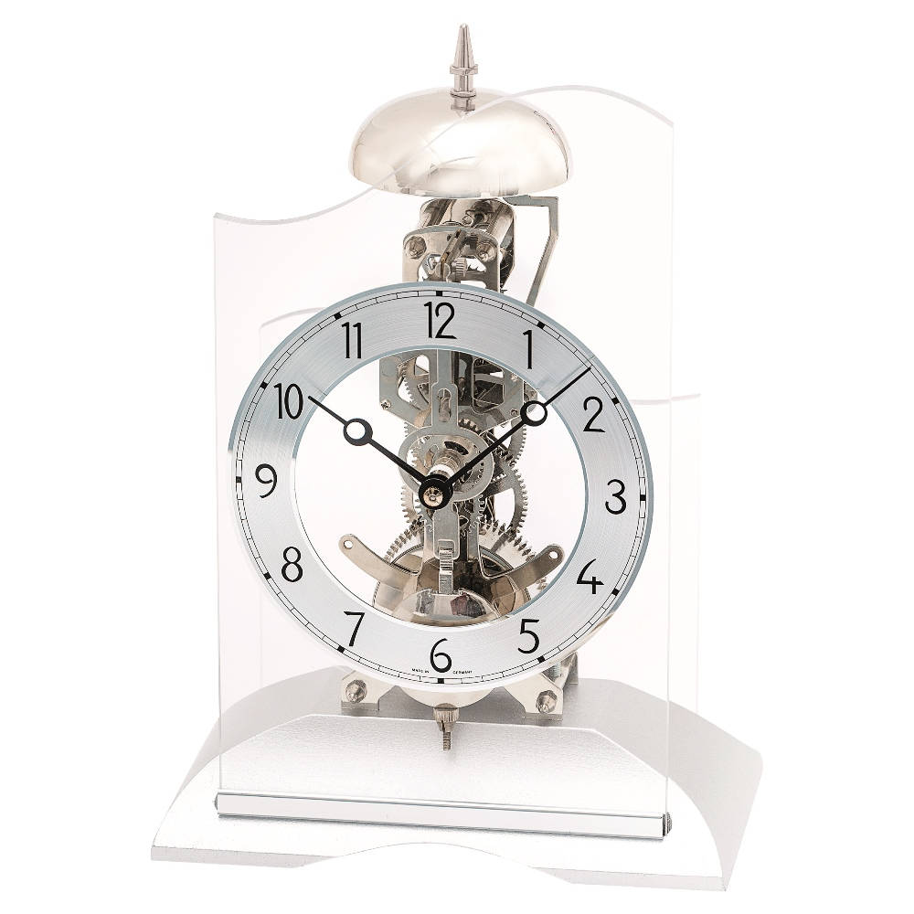 • Klok 1186 is een skelet tafelklok van messing in een glanzend zilverkleurige uitvoering met een mat zilver gelakte houten sokkel en mineraalglas.