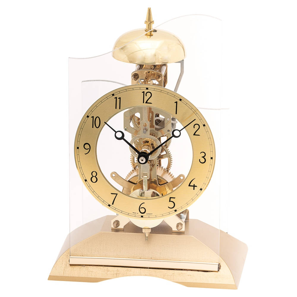 • Klok 1187 is een skelet tafelklok van messing in een glanzend messingkleurige uitvoering met een mat messing gelakte houten sokkel en mineraalglas.