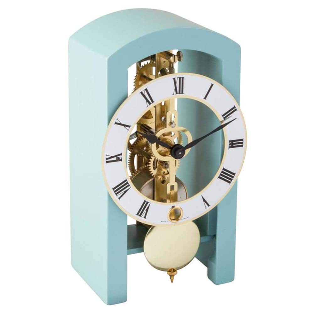 • Klok 23015-S40721 is een design skelet tafelklok in een lichtblauw (Pantone 545U) gelakt houten uitvoering met messing slinger, messing uurwerk en een zilver gekleurde cijferrand.