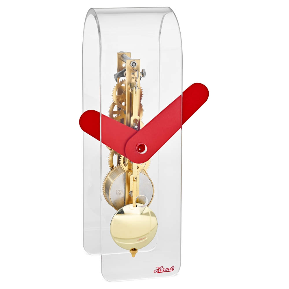 • De mat rode metalen wijzers zitten achter het acrylglas.