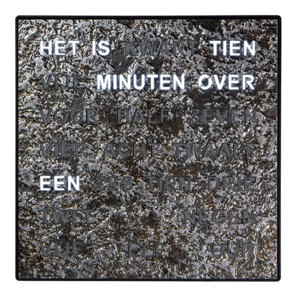 • Klok 1239NL is een digitale woordklok met een grafiet motief frontpaneel en een zwarte behuizing.