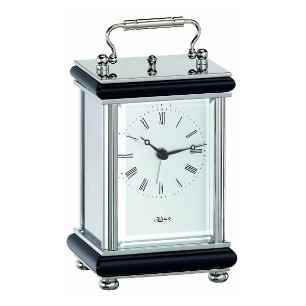 • Klok 12647-000202 is een luxe carriage klok van massief messing in een glanzende chroomkleurige uitvoering ingelegd met hoogwaardig piano finish zwart hout met geslepen mineraalglas aan de voorkant.