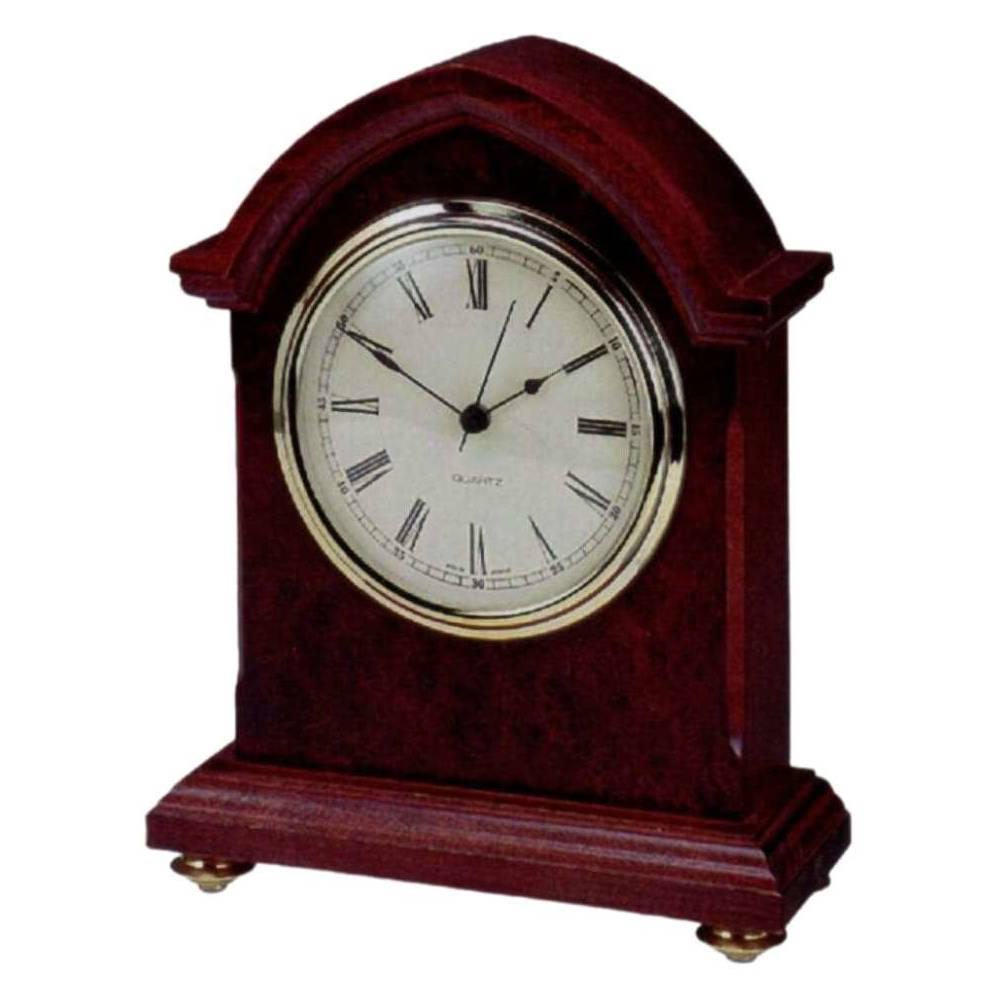 • Klok 120-450 is een tafelklok in spitsboogvorm van massief notenhout met wortelnotenhout en messing pootjes.