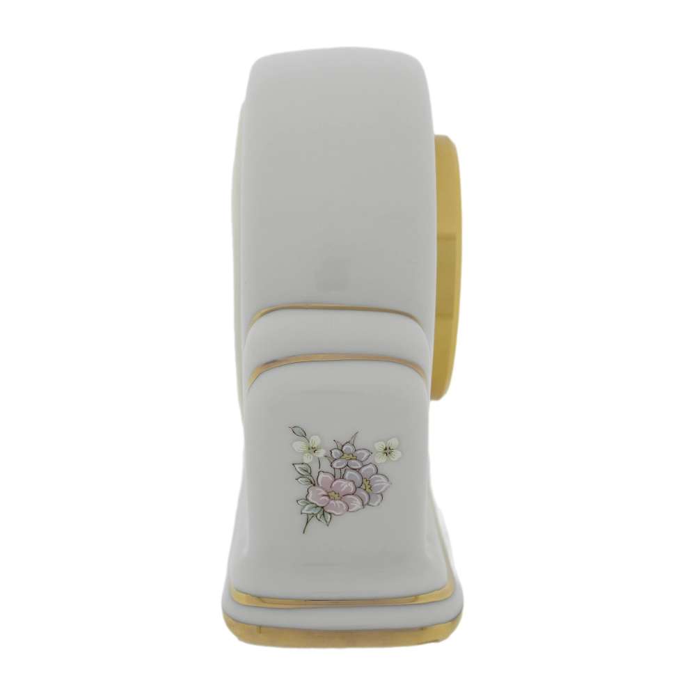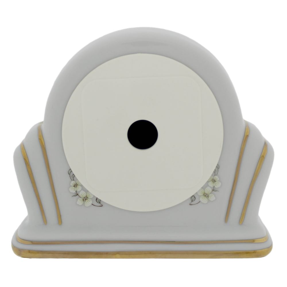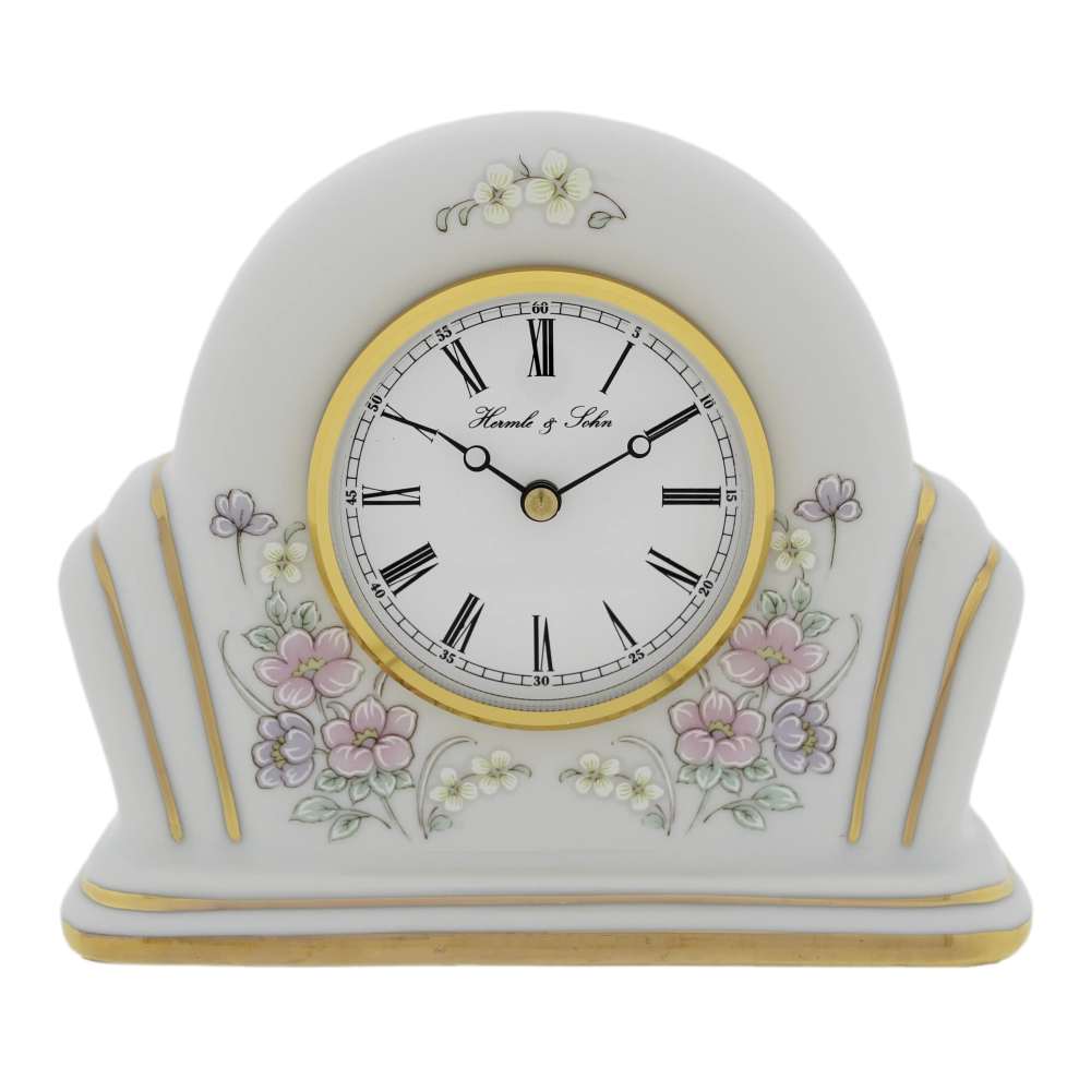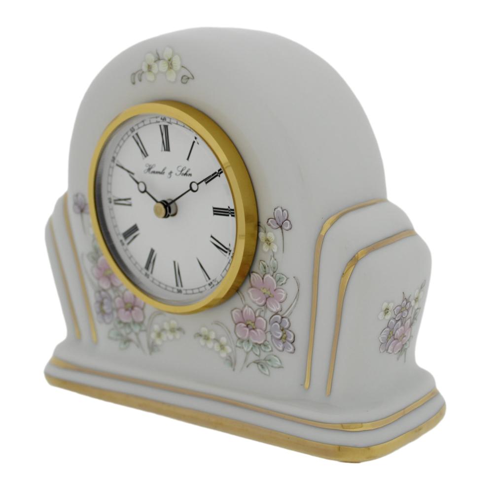 • Klok 22550-002100 is een witte Japans porseleinen tafelklok beschilderd met bloemen en goudkleurige biezen.