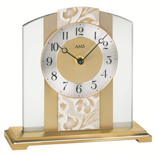 • Klok 1123 is een tafelklok in een geborsteld messing gekleurde uitvoering met mineraalglas, opgelegd met kunstlederen bloemen design en een aluminium wijzerplaat.
