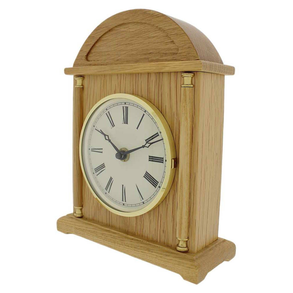 • Klok 120-200 is een tafelklok in een massief licht eikenhouten uitvoering met messing sierdelen.