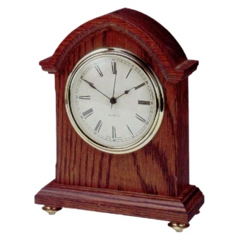 • Klok 120-420 is een tafelklok in spitsboogvorm van massief donker eikenhout met messing pootjes.