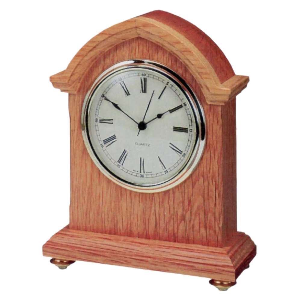 • Klok 120-430 is een tafelklok in spitsboogvorm van massief licht eikenhout met messing pootjes.