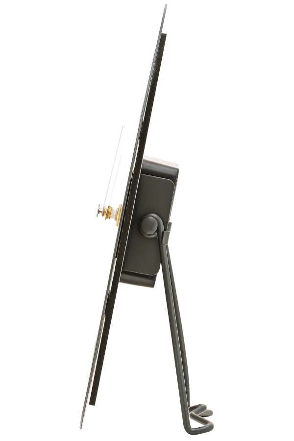 • Klok 1233 is een tafelklok met een antiekzilver motief wijzerplaat met een opgelegde mat zwart gelakte metalen cijferrand en een metalen standaard.