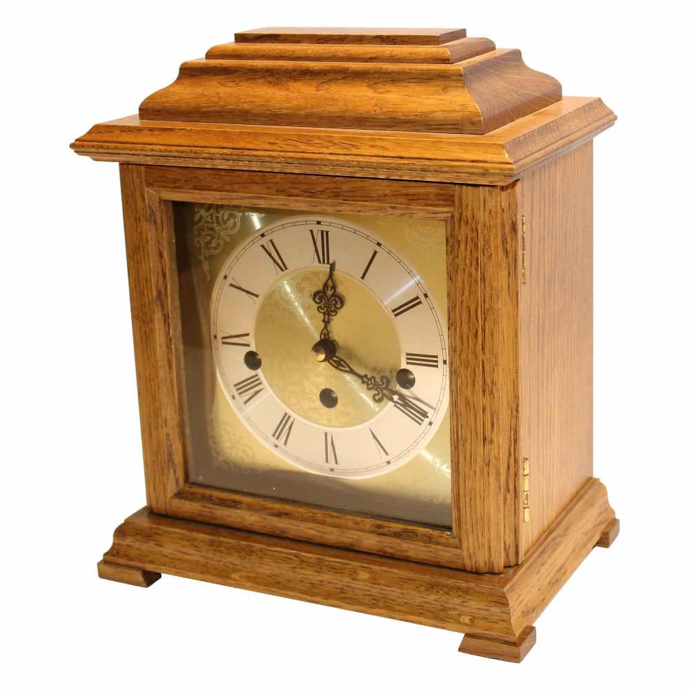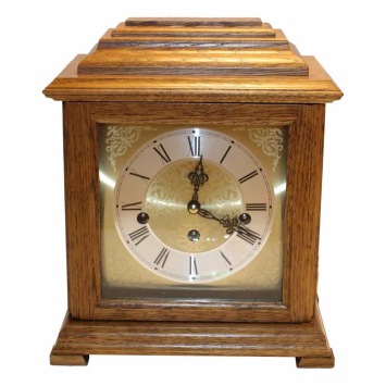 • Klok 1254-1101 is een tafelklok van massief midden eikenhout met een mineraalglas aan de voorkant en sierpatronen verwerkt in de messing wijzerplaat.