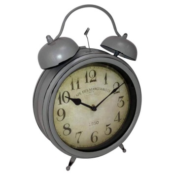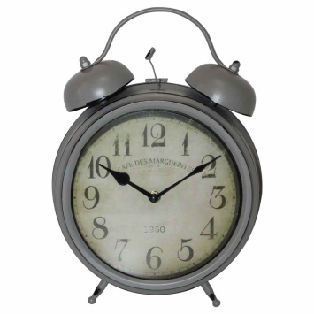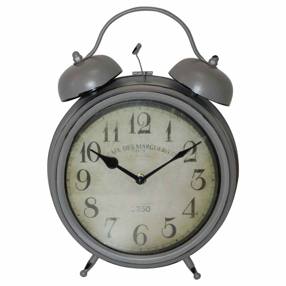 • Klok 18031072 is een tafelklok in een antiek stijl wekker model uitvoering van mat grijs gekleurd metaal met een antiek stijl wijzerplaat.