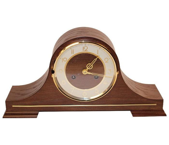 • Klok 21092-420150 is een tafelklok met een donker eikenhouten kast met een messing strip en rand rond het gebolde mineraalglas voor de wijzerplaat.