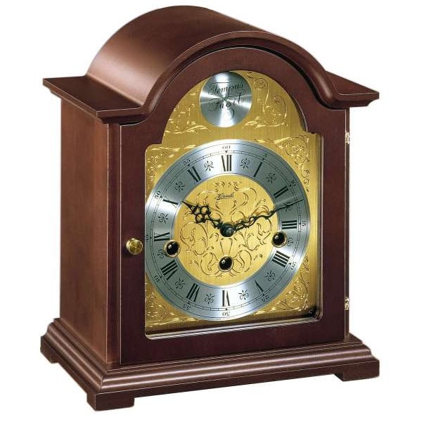 • Klok 22511-030340 is een tafelklok van massief notenhout met een mineraalglas aan de voorkant en sierpatronen verwerkt in de messing wijzerplaat.