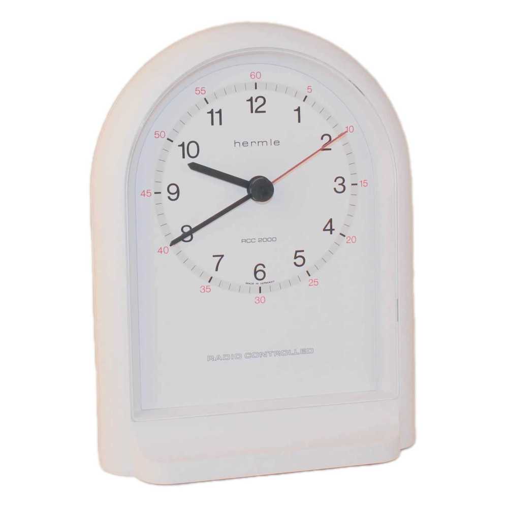 • Klok 22560-000800 is een tafelklok met een mat witte kunststof behuizing en plexiglas voor de witte wijzerplaat.