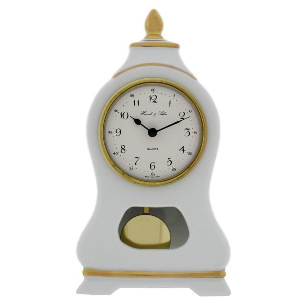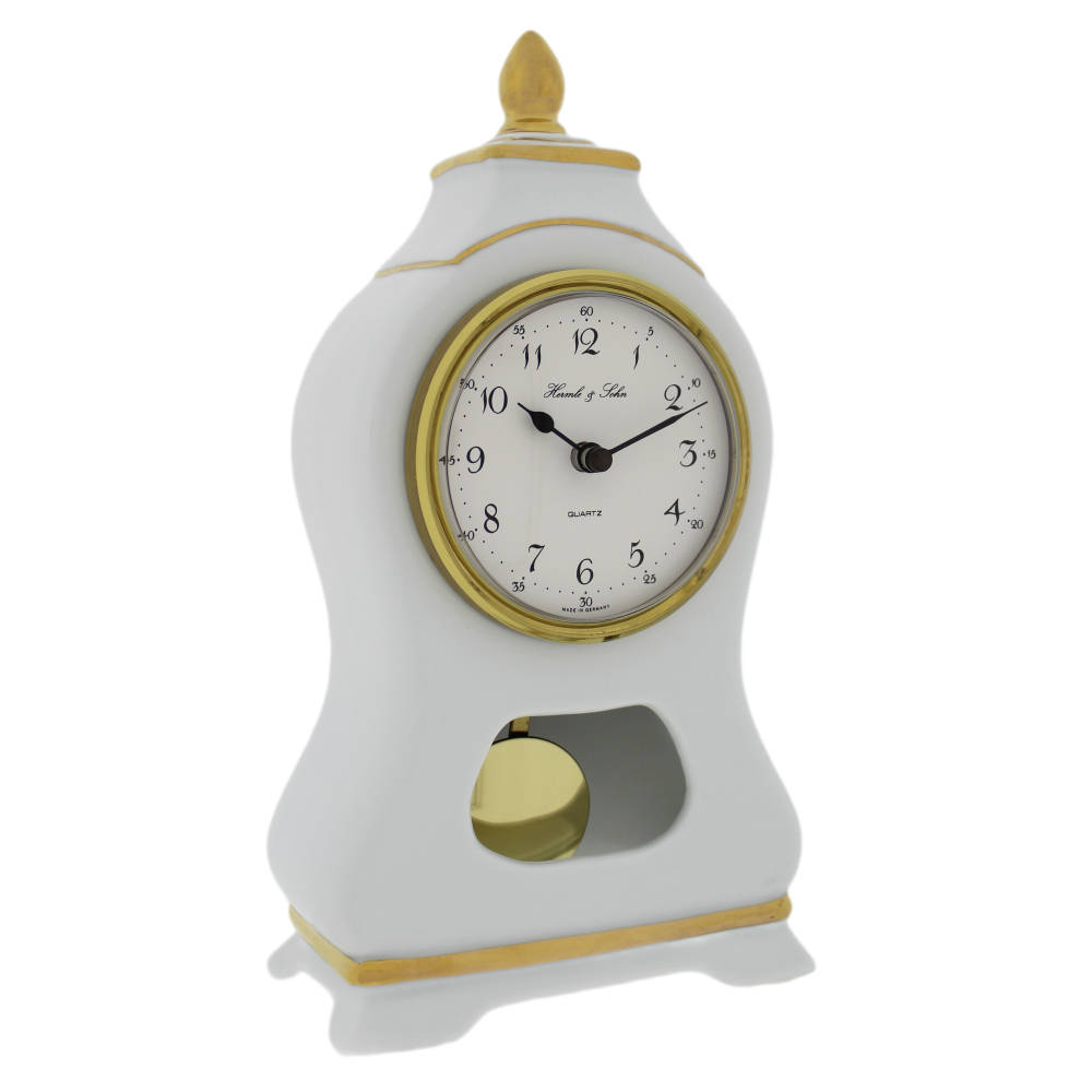• Klok 22570-002200 is een witte porseleinen tafelklok beschilderd met goudkleurige biezen en bovenstuk.