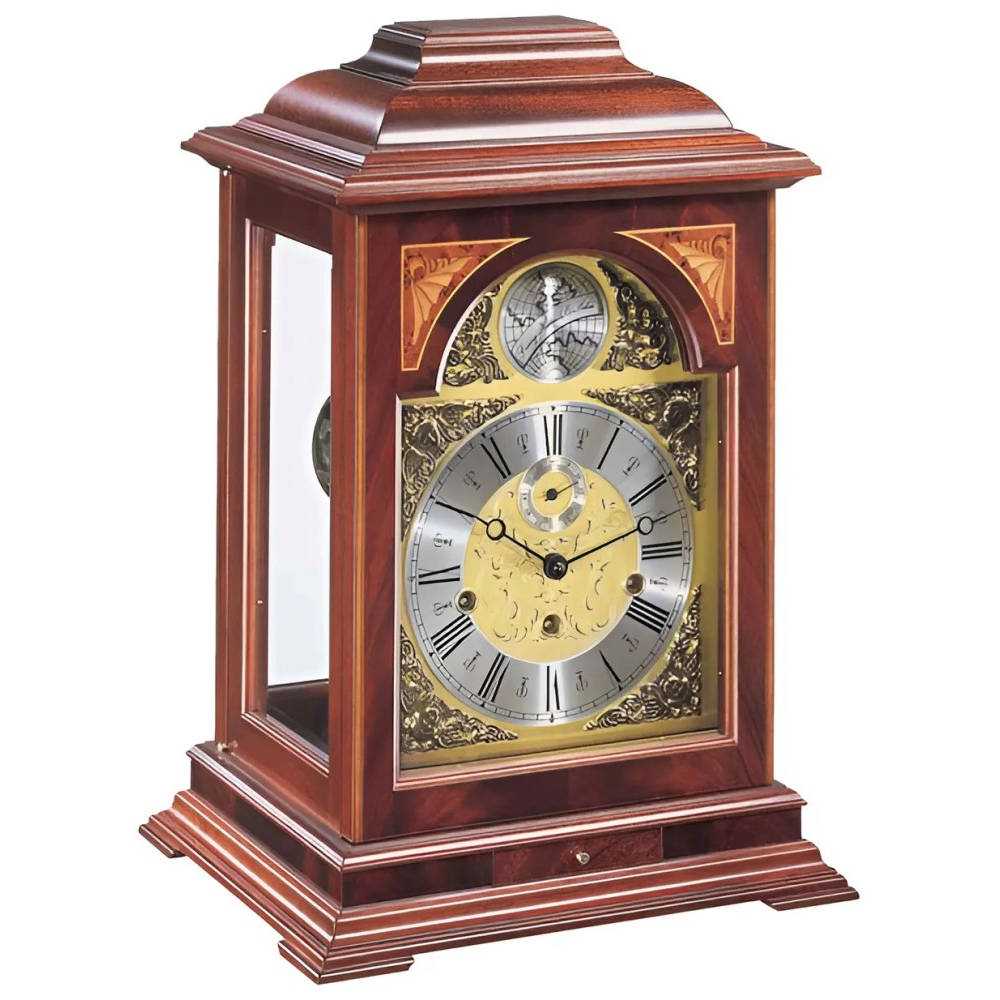 • Klok 22848-070352 is een luxe tafelklok van massief mahoniehout, ingelegd met houten sierelementen en sleutellade aan de voorkant.