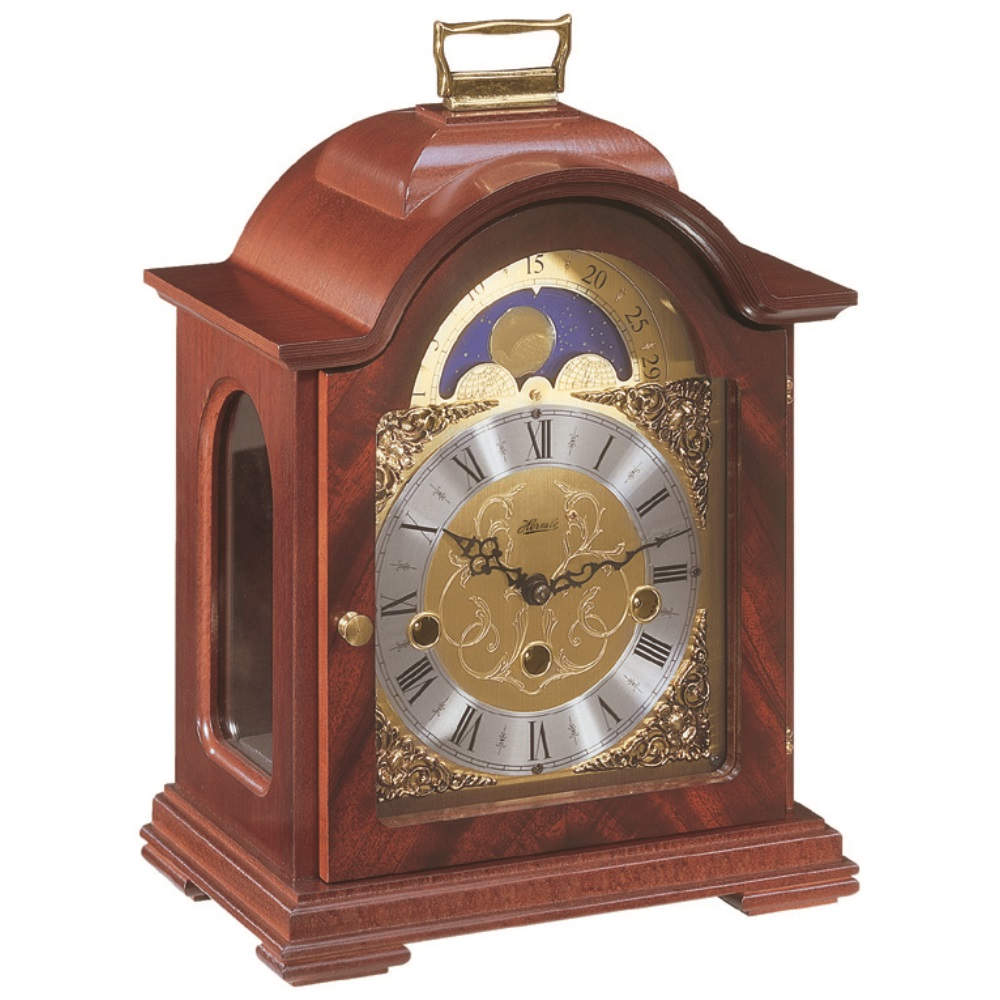 • Klok 22864-070340 is een tafelklok in een mahonie gelakte houten uitvoering met messing beugel.