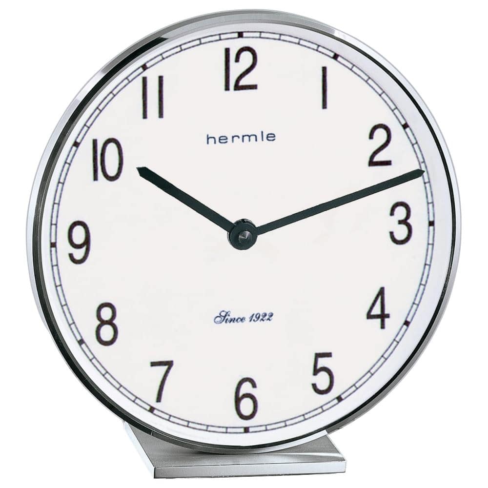 • Klok 23057-002100 is een tafelklok op standaard in een glanzende zilverkleurige metalen uitvoering.